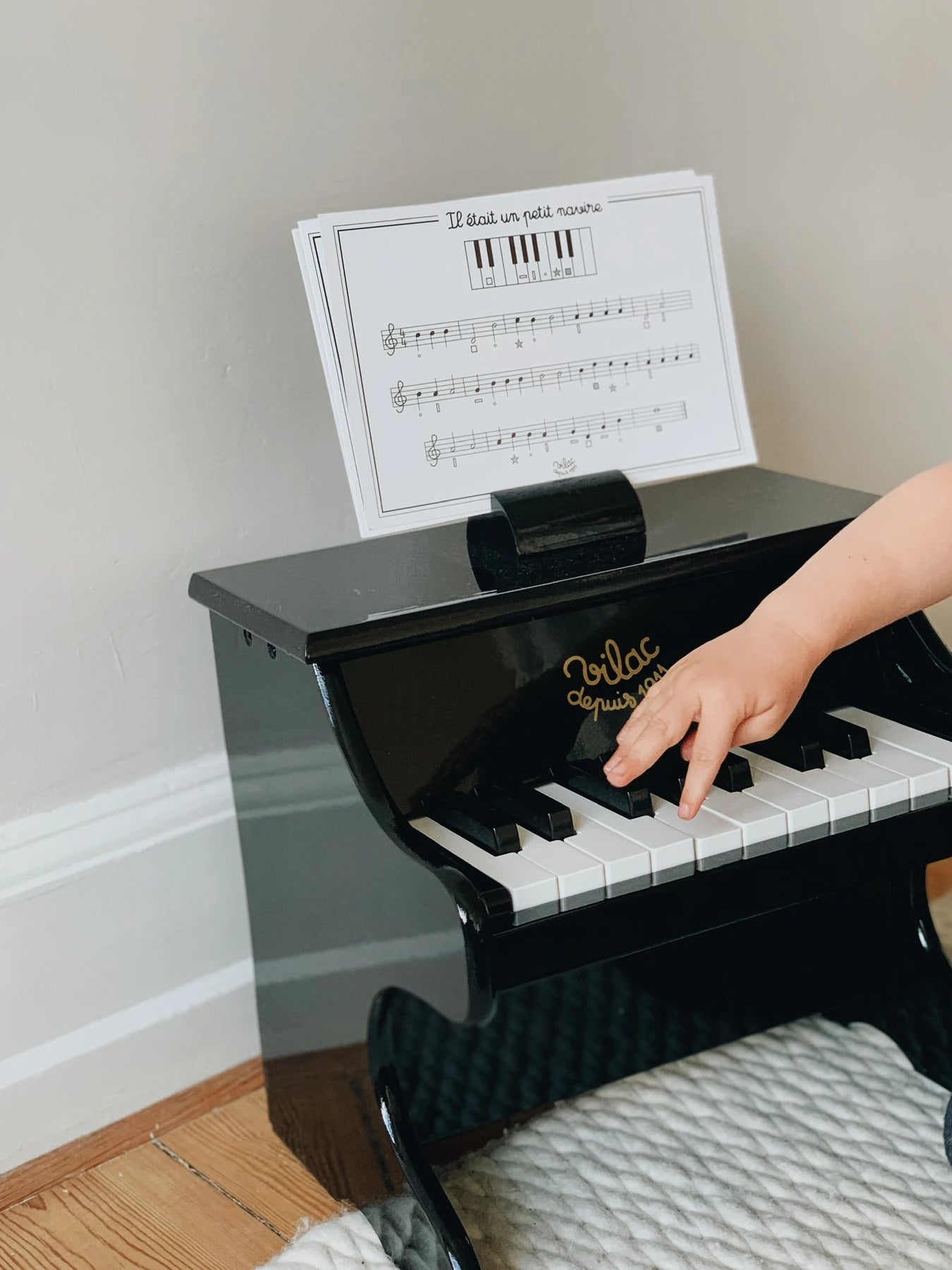 Ein echtes kleines Klavier für Kinder, auf dem kleine Musiker ihre ersten Stücke spielen können. Das Klavier ist aus Holz und schwarz lackiert. Das Instrument hat 18 Tasten, also eineinhalb Oktaven, und wird mit Noten geliefert. Das Spielzeug eignet sich auch ideal als Dekoration für das Kinderzimmer.